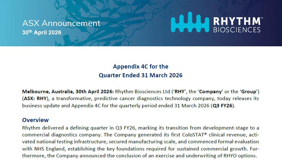 Welcome to Rhythm Biosciences' (ASX:RHY) Investor Centre, your gateway to essential information about our innovative cancer detection and risk assessment technologies.